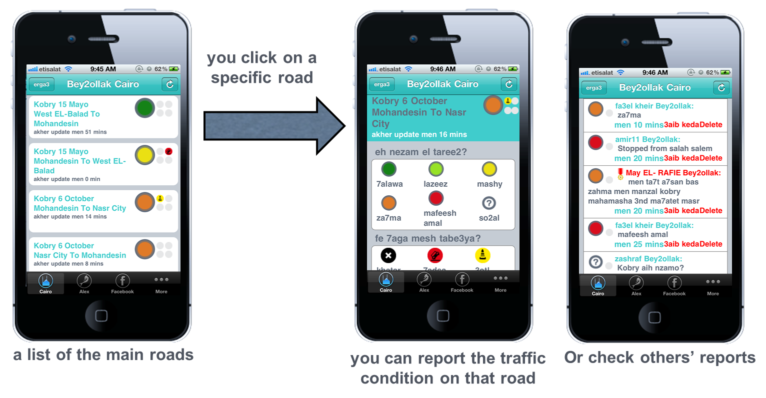 Bey2ollak started out as a concept to share information among friends. Like any other Cairo resident, Rafea faced the very real problem of spending far too much time sitting in Cairo traffic. Thinking of how friends and family often warn each other which route not to take, he thought, why not create an application that caters to that very need.